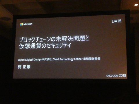 日本マイクロソフトは5月22日から2日間、開発者向けカンファレンス「de:code 2018」を開催した。ITに携わるすべてのエンジニアを対象に、未来を創る最新テクノロジーを紹介するイベント「de:code 2018」は、有識者による基調講演をはじめ、数多くのセッションやハンズオンが開かれ、最新テクノロジーを学ぶことができる。今回は、「ブロックチェーンの未解決問題と仮想通貨のセキュリティ」をテーマにしたJapan Digital Design株式会社(以下、JDD)業務開発部・業務開発部長・CTOの楠 正憲氏のセッションに参加した。