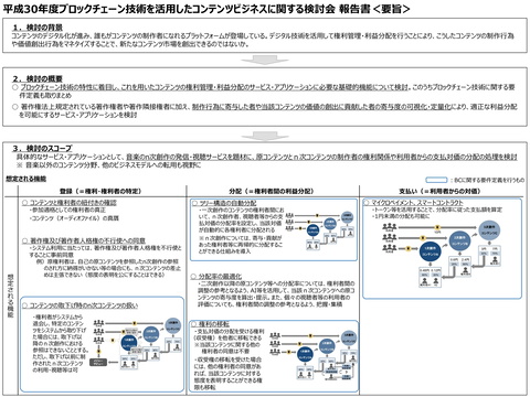 また、本検討に関連しては、コンテンツグローバル需要創出等促進事業費補助金(平成30年度二次補正予算)において、ブロックチェーン技術を活用した新たなコンテンツ制作・流通システムを開発・実証を行う事業への支援を予定しているという。